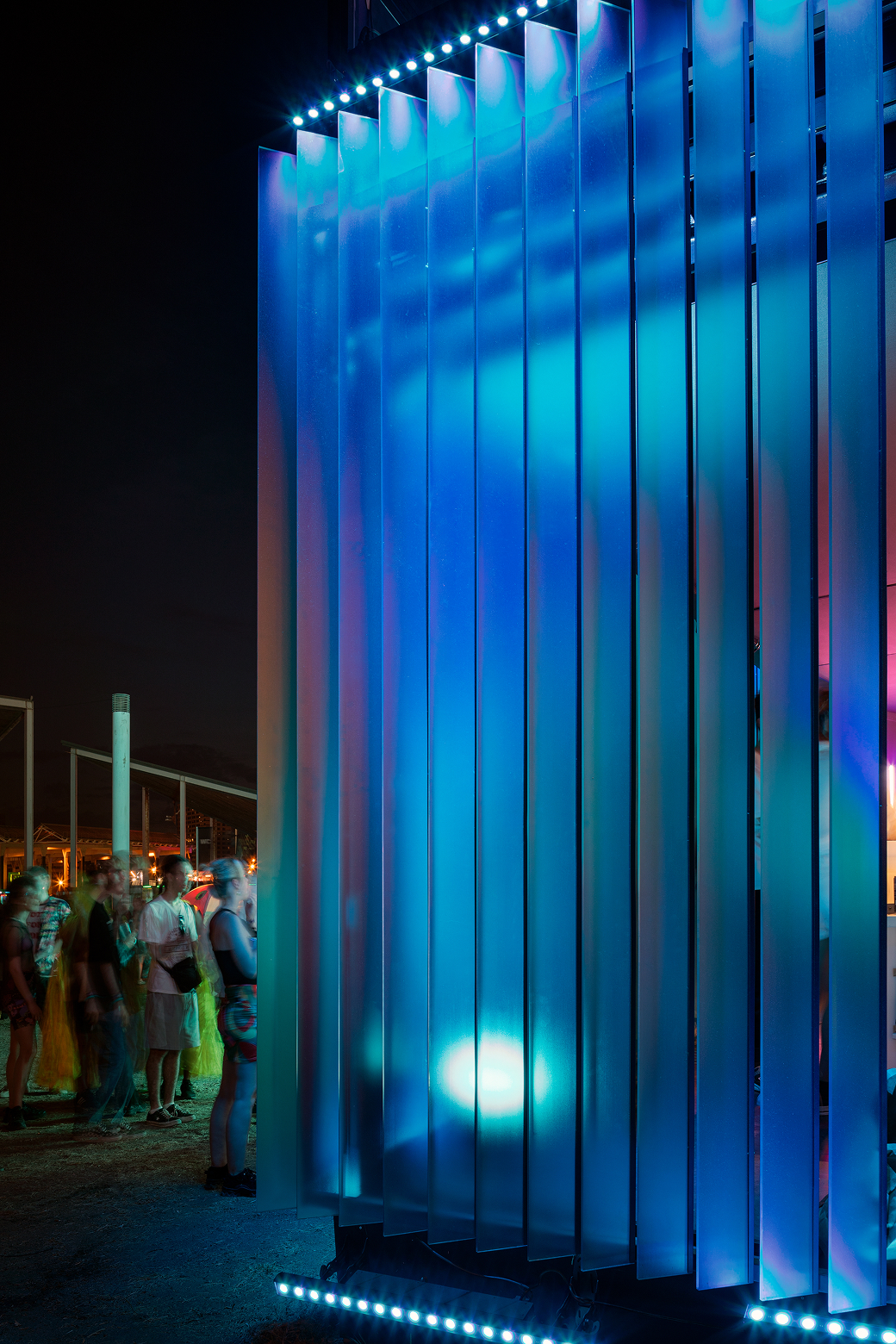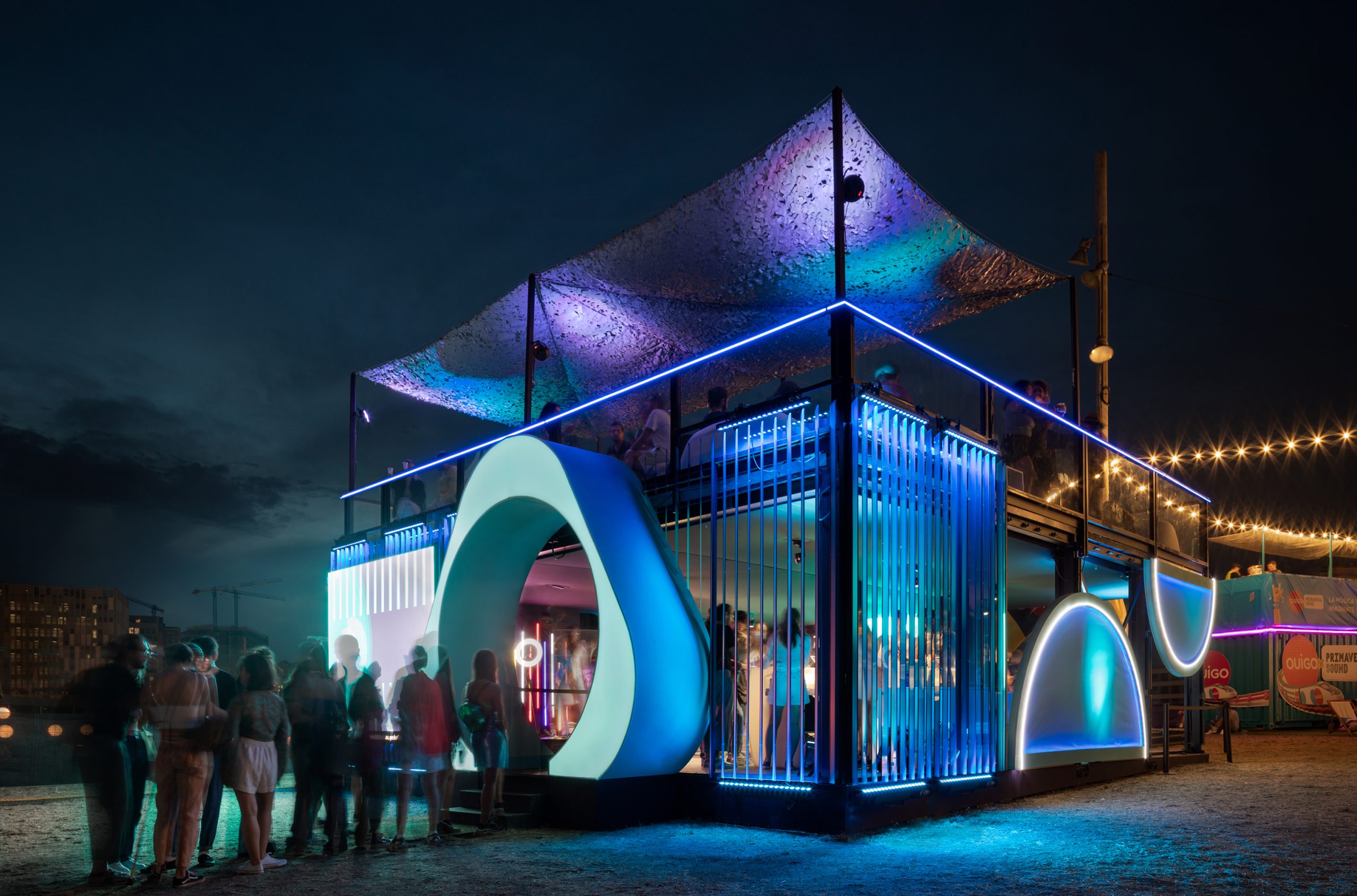 El espacio de IQOS se concibió como un entorno memorable, lumínico y etéreo, en sintonía con el ambiente vibrante del festival. Su estructura de doble altura se erigía como un hito visual dentro del recinto: una pieza icónica que combinaba dinamismo lumínico con una estética translúcida y semitransparente, generando una presencia tan ligera como hipnótica, entre lo psicodélico y lo festivalero.